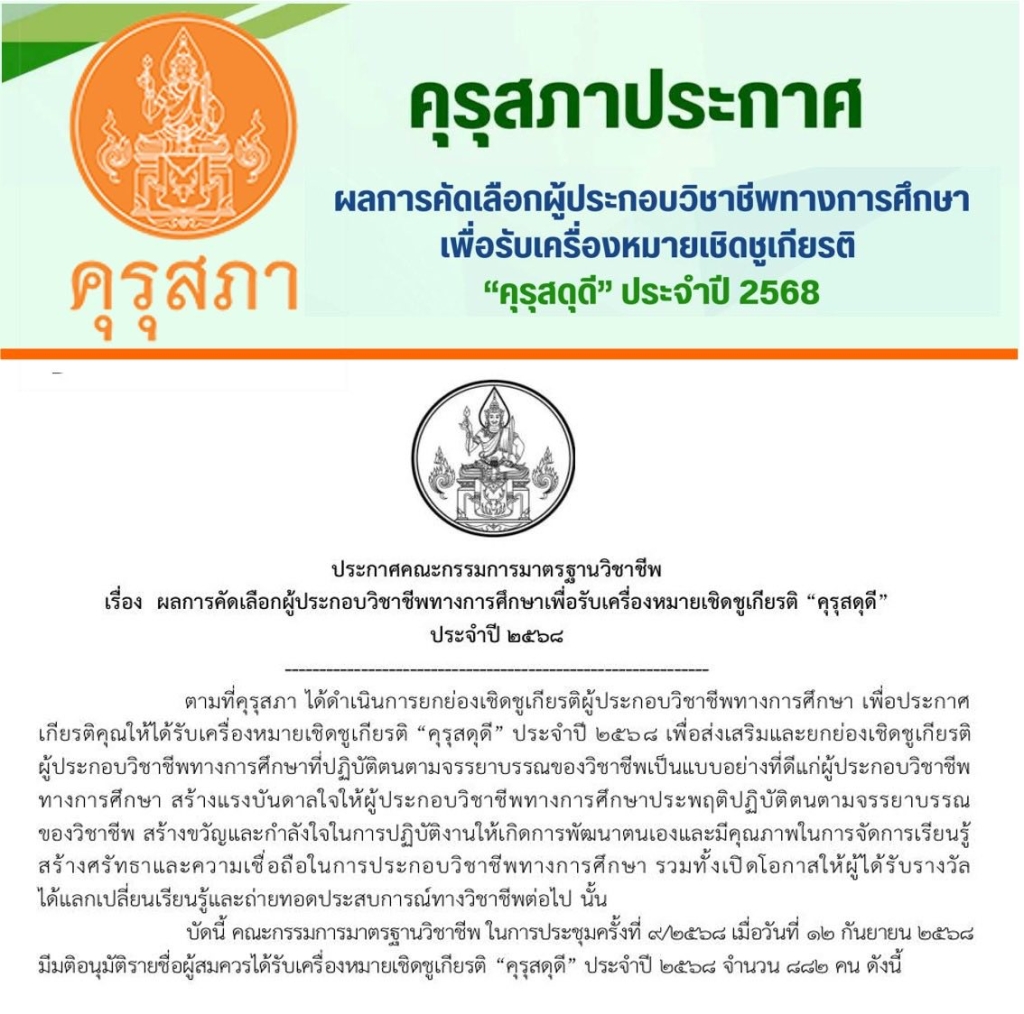 This recognition was approved by the Teachers’ Council of Thailand (Khurusapha) Professional Standards Committee on 12 September 2025.